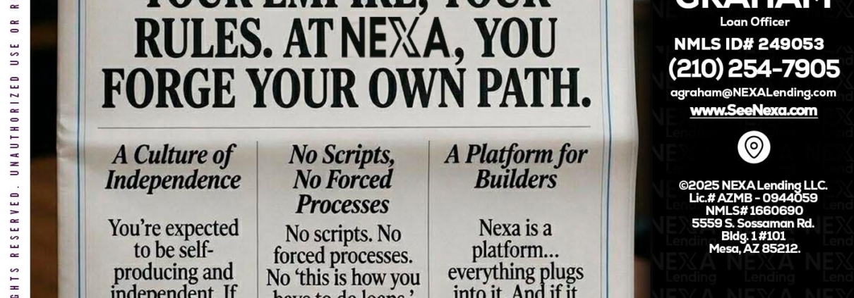 THE NEXA BUILDER - Adam Graham -Mortgage Loan AdvisorHi, my name is Adam Graham. I’m a Loan Officer with NEXA Lending LLC., offering personalized mortgage solutions, fast customized quotes, great rates and service with integrity.