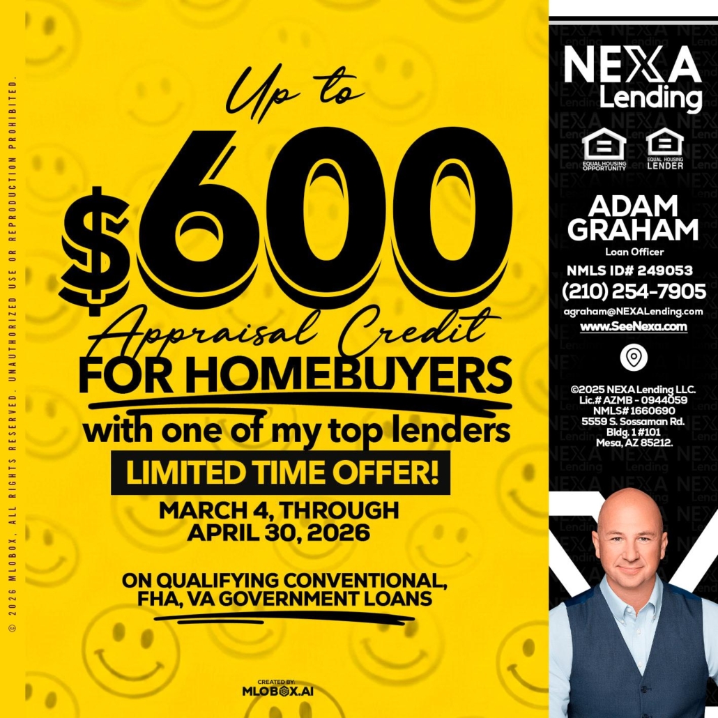 UP TO 600 - Adam Graham -Mortgage Loan AdvisorHi, my name is Adam Graham. I’m a Loan Officer with NEXA Lending LLC., offering personalized mortgage solutions, fast customized quotes, great rates and service with integrity.