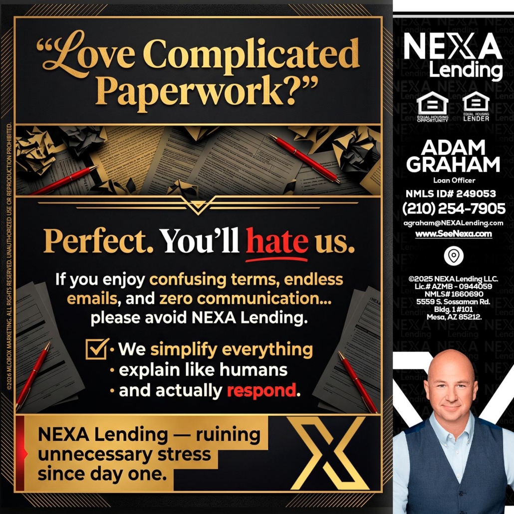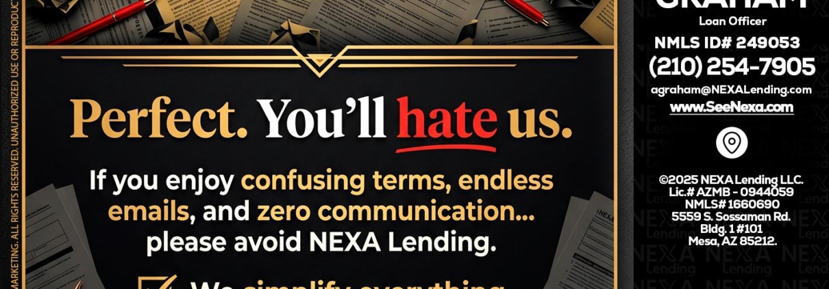 YOU WILL HATE US! - Adam Graham -Mortgage Loan AdvisorHi, my name is Adam Graham. I’m a Loan Officer with NEXA Lending LLC., offering personalized mortgage solutions, fast customized quotes, great rates and service with integrity.